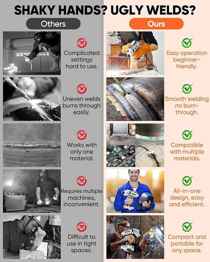 KOMPAKT UND TRAGBAR: Dank der geringen Größe und des leichten Designs ist das Schweißgerät äußerst mobil. Perfekt für Arbeiten in großer Höhe oder überall dort, wo Sie es bequem einsetzen möchten.